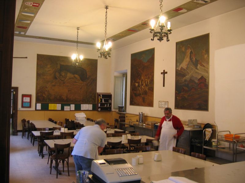 Gardemensa im Vatikan mit drei Bildern (oben). Von links: das Löwendenkmal (Maler unbekannt), die Gotthardpost (von Robert Schiess) und das Matterhorn (von Robert Schiess). Bilder um 2005, vor der Kantinenrenovation.