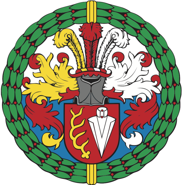 Das Vollwappen wird von einem grünen Lorbeerkranz mit roten Beeren umrahmt, oben und unten in Gold geschnürt. Der Lorbeerkranz steht als Symbol für eine besondere Ehre oder Auszeichnung. Schon im Perserkrieg (5. Jahrhundert v. Chr.) taucht diese Militärkrone (corona) als Auszeichnung auf. Die alten Römer führten verschiedene Kränze als Auszeichnung, beispielsweise die Lorbeer-, Oliven- und Myrtenkränze. Die corona civica, eine Eichenlaubkrone, bekam jener Soldat, der einem Mitbürger das Leben rettete. – Um nicht an die frühere verpönte Königsherrschaft zu erinnern (um 550 v. Chr. – 509 v. Chr.), trug der römische Kaiser einen Lorbeerkranz und keine Krone. Gajus Julius Cäsar, schon früh mit Glatze, soll ihn den ganzen Tag getragen haben. – Die Schweizer Generäle tragen beispielsweise lorbeerbekränzte Hüte. Die schweizerische 5-Franken-Münze weist auf der Rückseite Lorbeerblätter (für Sieg) und Eichenblätter (für Stärke) auf.