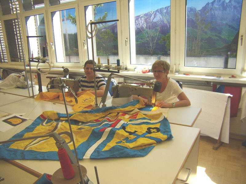 Projekte zeichnen, Werkzeichnung erstellen, Werkzeichnung kontrollieren, stüpfeln (stupfen), zuschneiden, präparieren, sticken, spannen, konfektionieren, Ringe annähen. Bei der neuen Gardefahne mussten Spezialkarabiner befestigt und gebügelt werden.